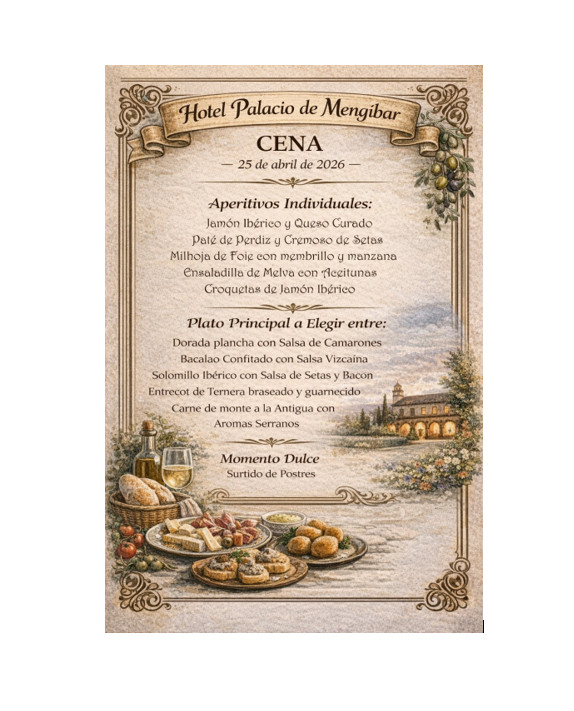 Cena: En el hotel, Palacio de Mengíbar. Incluida en la tarifa MP. (Bebidas excluidas.)
