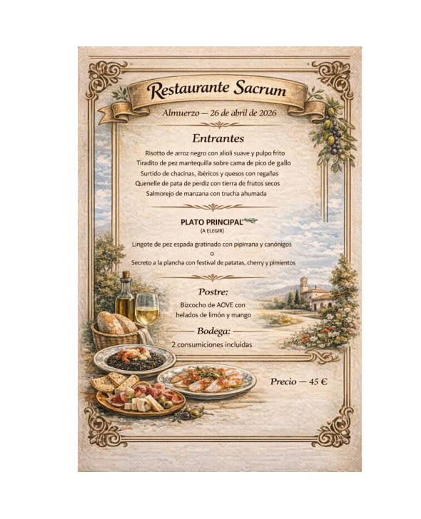 La comida en el singular Restaurante Sacrum dentro del complejo Ermita Madre de Dios pondrá el broche final al viaje: un cierre sereno, gastronómico y lleno de sentido para una concentración que habrá incluido paisaje, historia y disfrute.