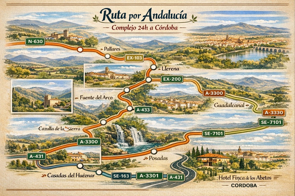 La ruta concluirá en el Hotel Finca de los Abetos, rodeado de naturaleza y tranquilidad, cerrando la jornada tras una experiencia completa de dehesa, sierra, ríos y pueblos.