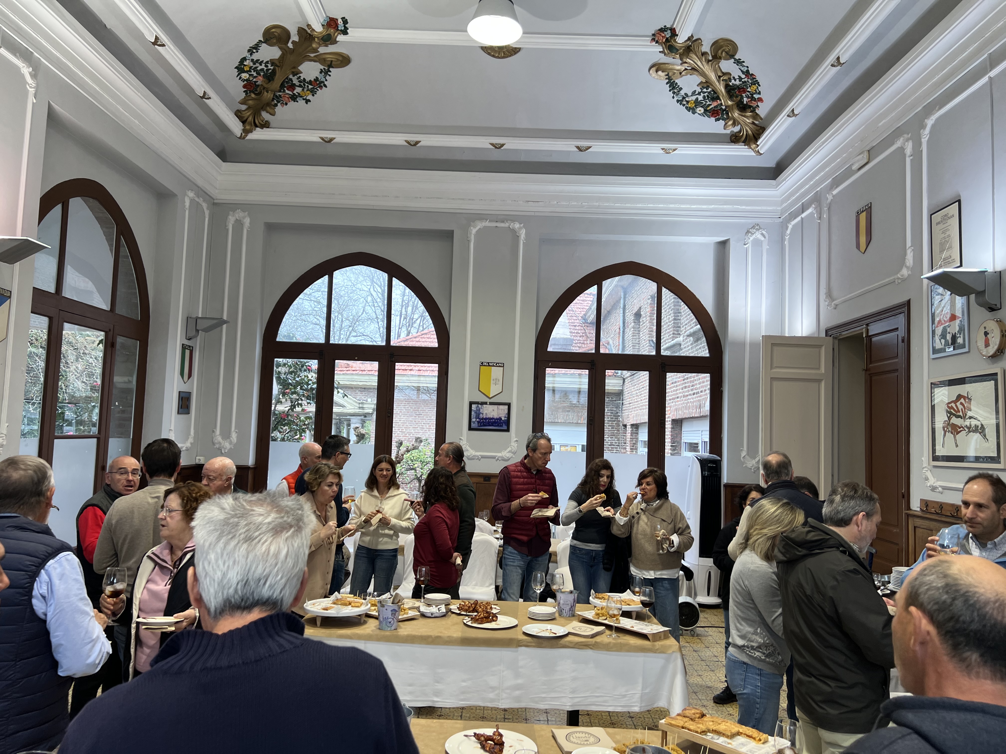 Salimos de Cartes por Riocorvo dirección a Los Corrales y seguimos hasta Arenas de Iguña, allí cruzamos por La Montaña para ir al valle de Toranzo y dirigirnos al norte para pasar por Puente Viesgo y poco después desviarnos a la izquierda por un tramo en el que debía de haber un rally de clásicos haciendo el sentido contrario. Esto nos acercó de nuevo a Torrelavega donde nos esperaban en el casino con las puertas de los jardines abiertas para nuestro aparcamiento y dentro un picoteo abundante y delicioso para recuperar fuerzas.