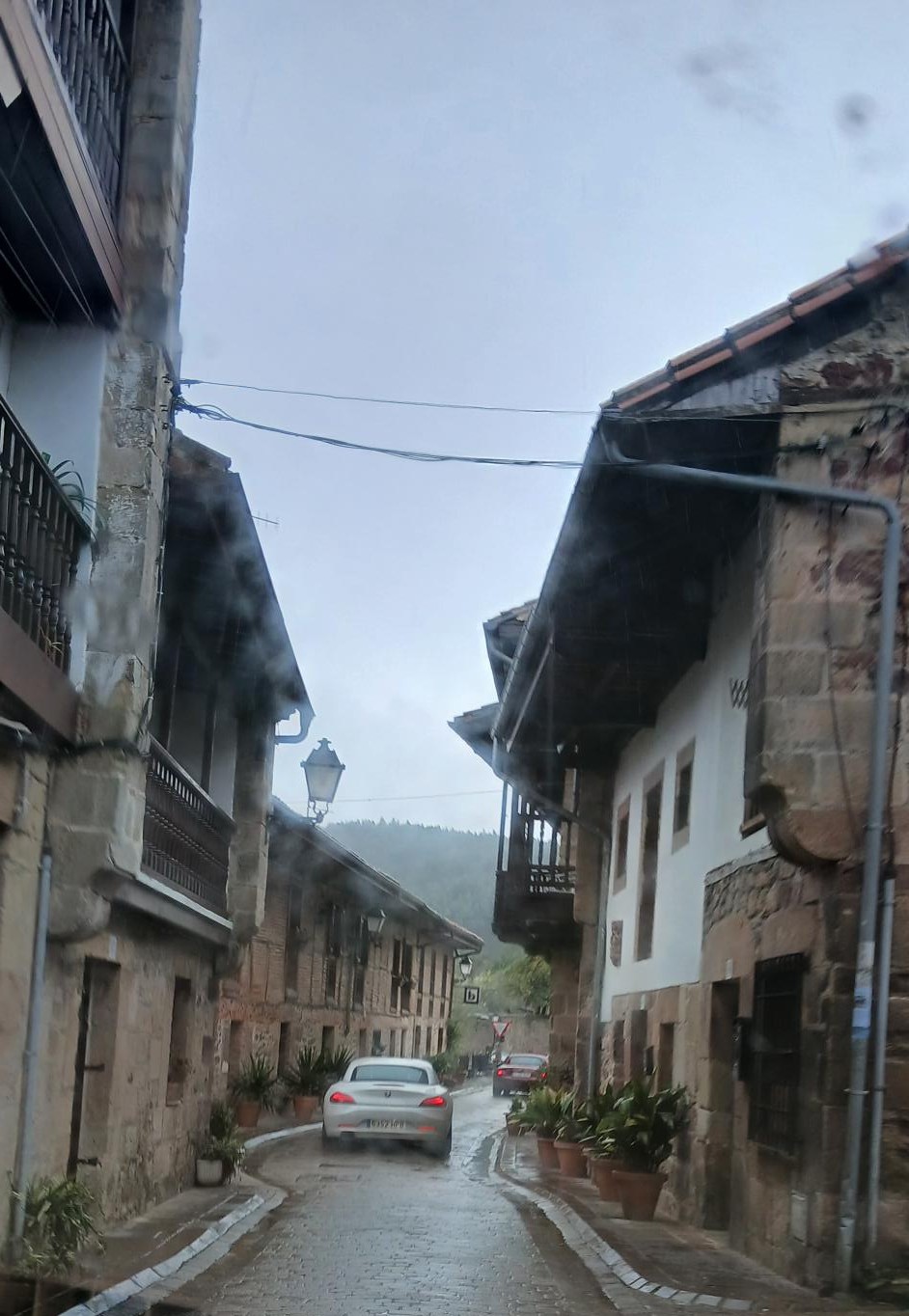 No fue así. Amaneció cubierto y lluvioso. Con la esperanza de que mejorara el día, y después del briefing, donde Manolo nos explicó la ruta a seguir, bajamos al garage del hotel  para arrancar nuestras monturas e iniciar ruta, y descubrimos que un “lindo gatito” había pernoctado junto a ellas, junto a unas más que a otras, y nos había dejado las huellas de su caminar y de su descanso en el capó y en la capota. Afortunadamente le debieron de gustar las sensaciones, ya que sólo nos dejó pisadas y pelos, y ningún arañazo a la vista.