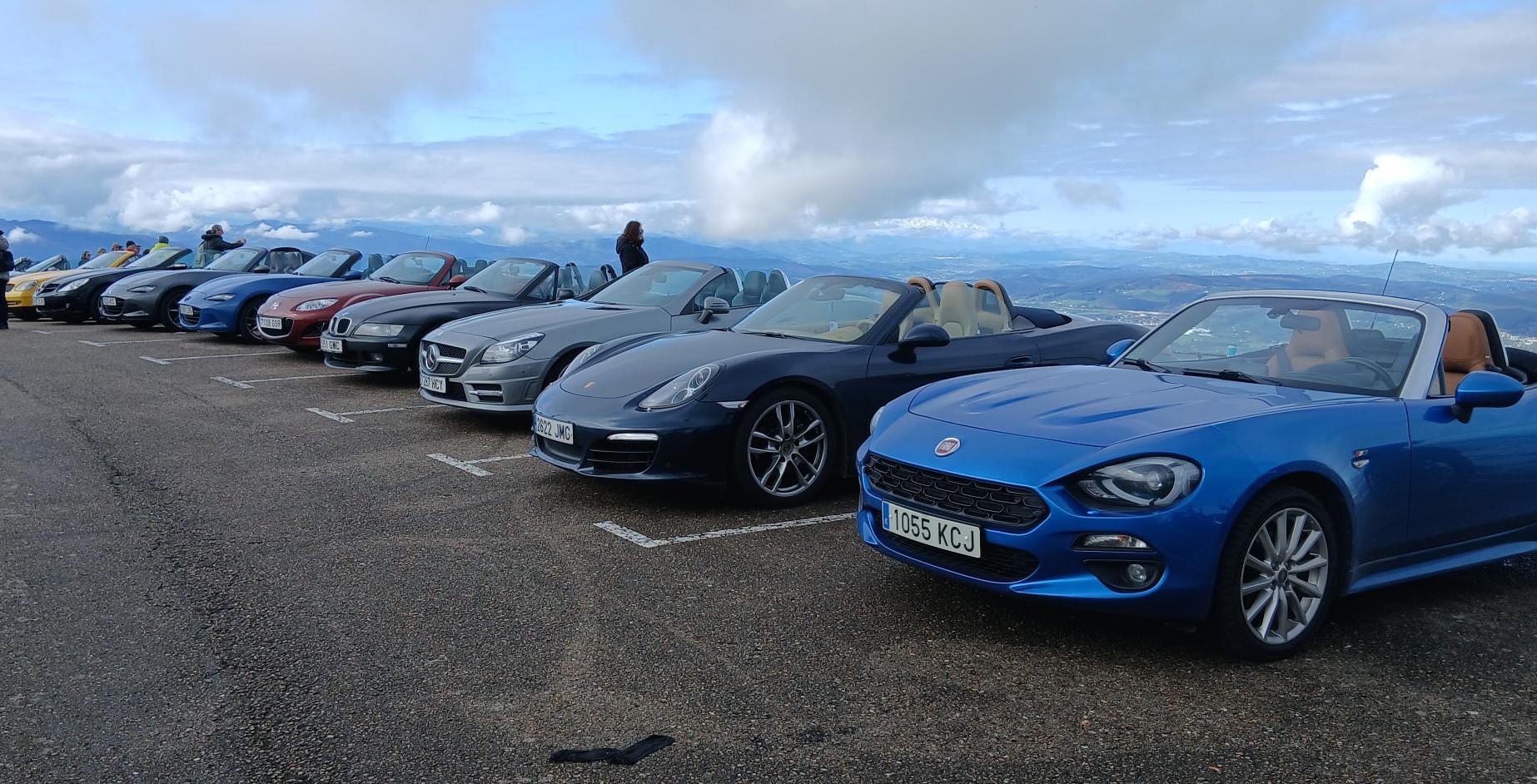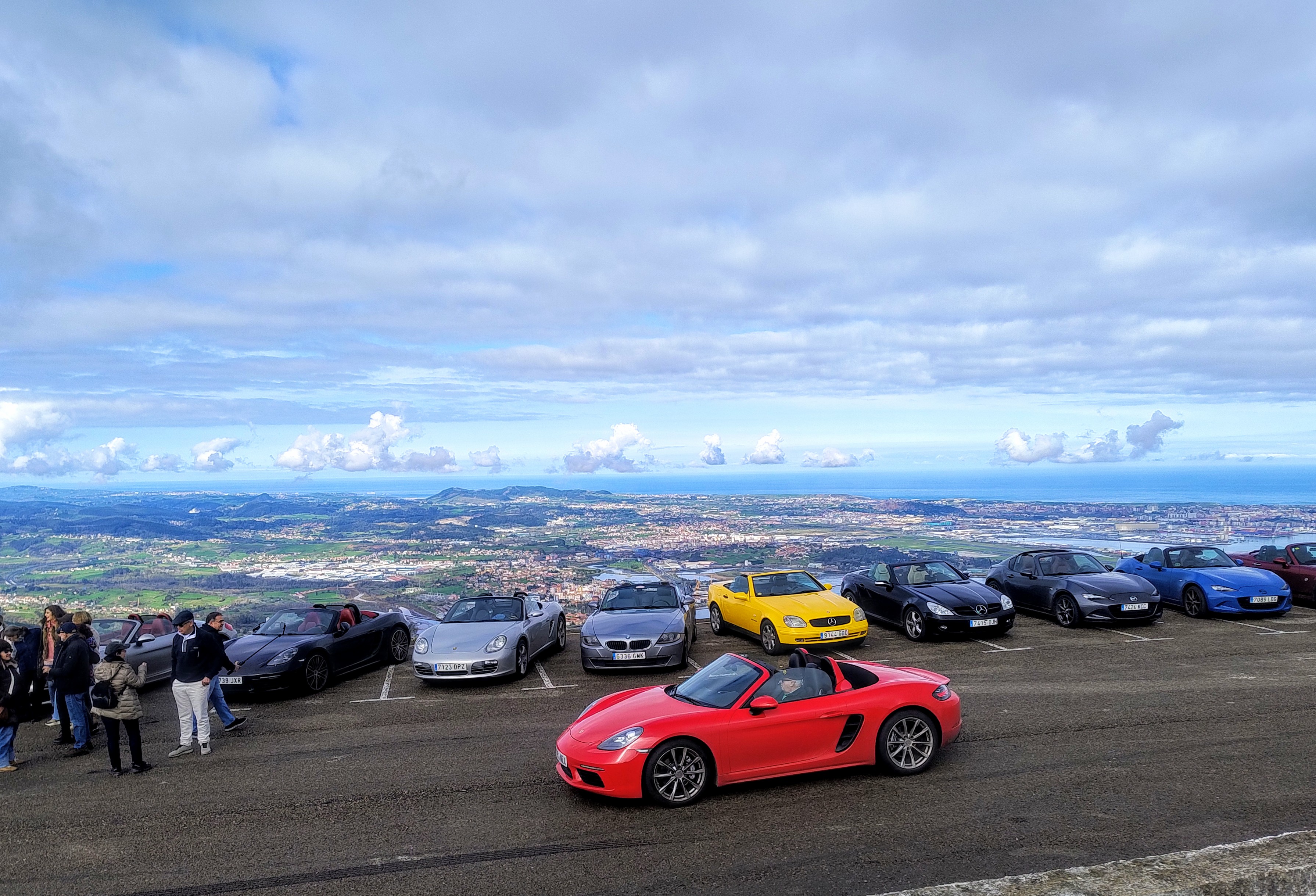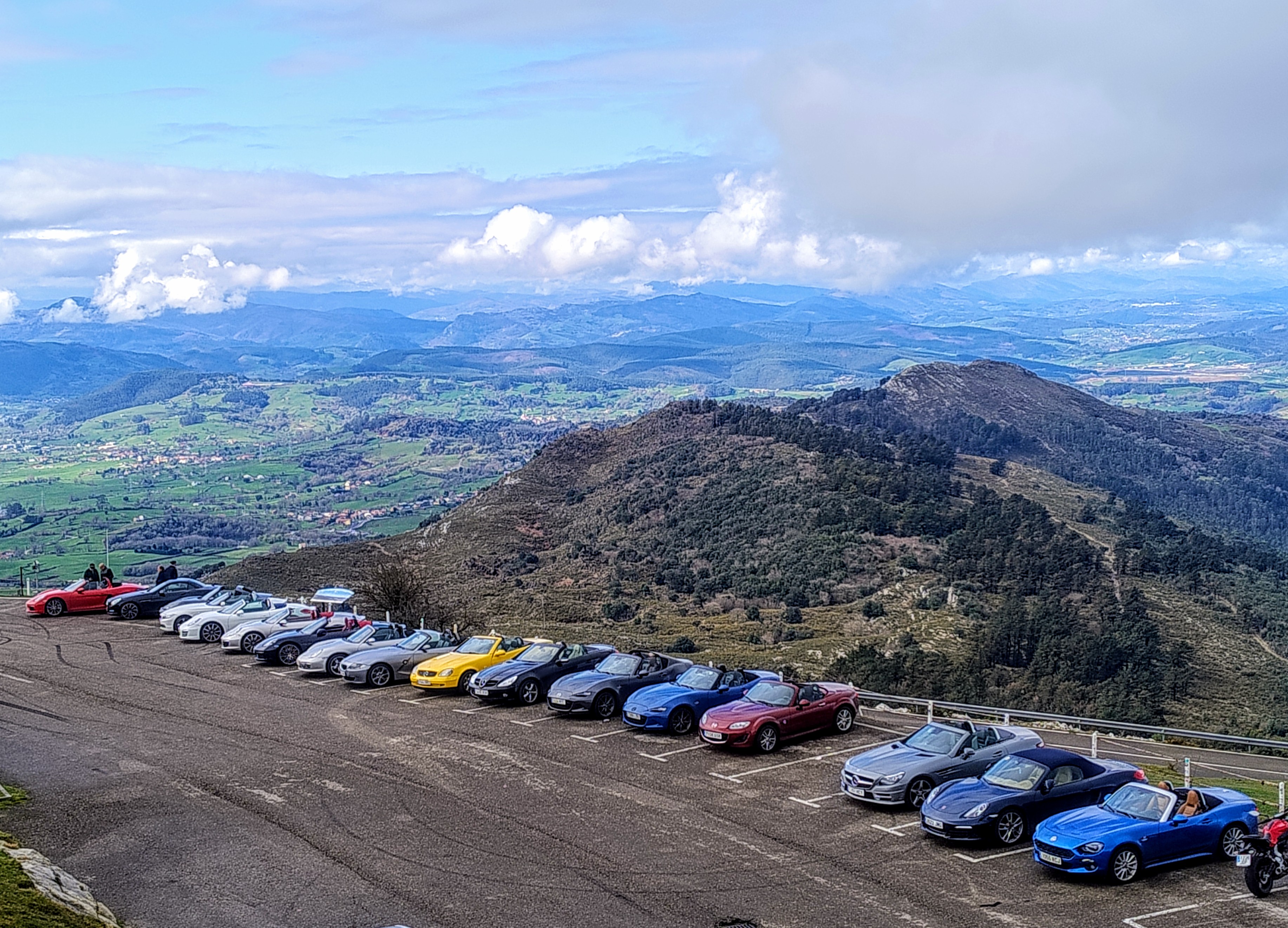 De nuevo salimos hacia Cartes, pasamos Riocorvo y antes de llegar a los Corrales nos metimos por el puerto de Hijas hacia el valle de Toranzo, donde tomaríamos la carretera nacional pero esta vez en dirección sur. Unos kilómetros después de Ontaneda giramos a la izquierda para ir hacia Vega de Pas y allí tomar el precioso alto de la Braguía. Muy buen asfalto y muchas curvas. Una subida rápida y bajada hacia Selaya con poquísimo tráfico, donde a los que íbamos un pelín más lentos nos tuvieron que esperar un poquito, y a partir de ahí ya con un poco más de tráfico fuimos avanzando para acabar subiendo al precioso mirador de Peña Cabarga, donde se hizo la mayor parada social de toda la concentración porque por fin podíamos bajarnos del coche descapotados. Un rato admirando las vistas, un café una charla y desgraciadamente la mañana estaba casi terminando. Ya solo nos quedaba una horita más de ruta para llegar a comer en el estupendo campo de golf que nos había reservado una zona específicamente para nuestros coches. Tuvieron además el detalle de ponernos una mesa cuadrada en la que todos podíamos vernos y allí ya nos dieron un rico menú y la verdad es que, con mucha pena, esto tocaba a su fin. Era la hora de despedidas y propósitos de volver a encontrarnos de nuevo en la siguiente.