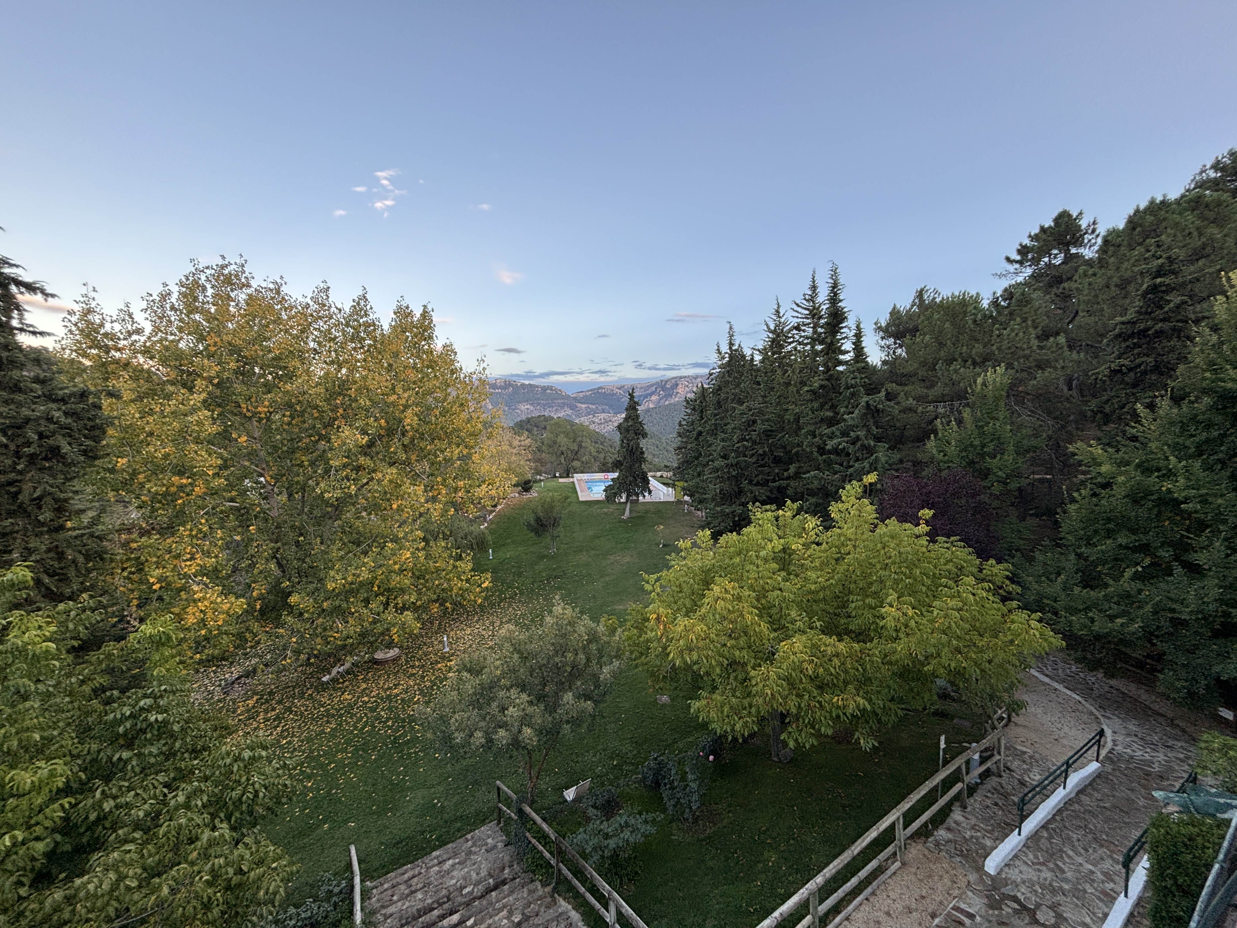 Nosotros llegamos sobre las 18:00 al Hotel El Curro de Burunchel, saludos a los que estaban en recepción y checking rápido ya que a las 18:30 estábamos convocados para una miniruta de 17 kms hasta el Parador de Cazorla que está completamente aislado en plena montaña. Por el camino ya se nos atravesó muy tranquilos una familia de ciervos demostrándonos quien estaba en su territorio y quienes éramos los invasores. Sólo tengo un par de fotos de las preciosas vistas  ;) desde la terraza del Parador.