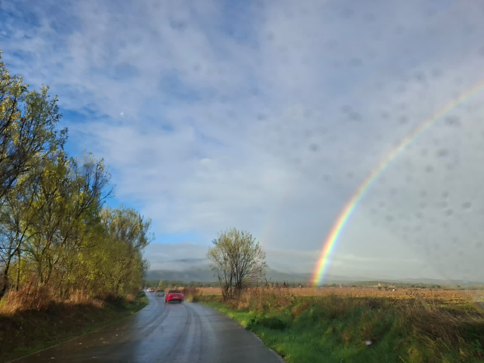 Después de comer, el sol mostraba sus ganas de salir, aunque no era suficiente para descapotar. Pero cuando apareció el arco iris, trazado con compás y con unos colores de una intensidad nunca vista, empecé a creer que la tarde deparaba algo especial. En pocos minutos, capotas fuera y a disfrutar de la carretera y el paisaje al más puro estilo roadster.