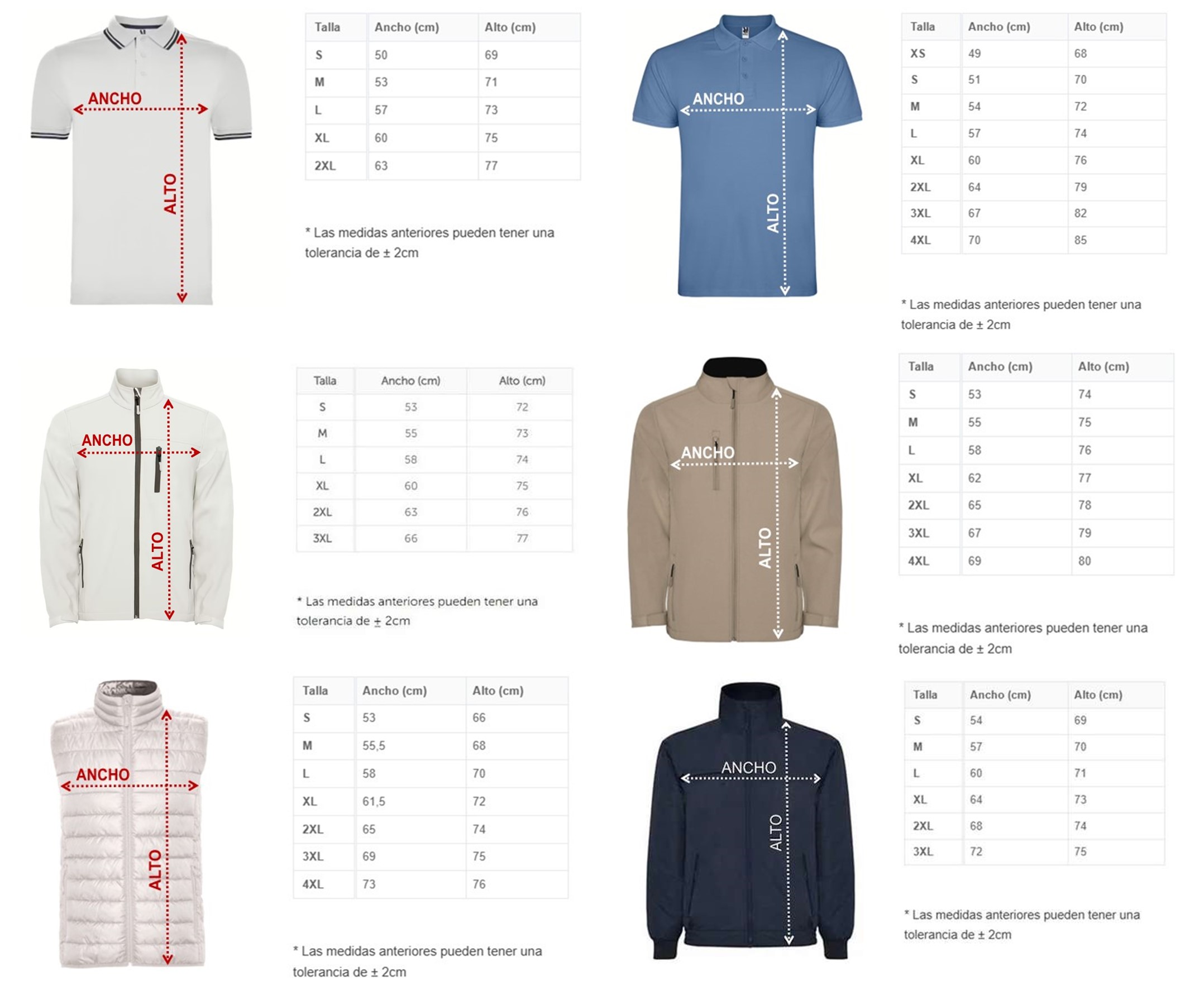 Las medidas que se ven con el polo blanco, son las correspondientes a los polos blanco y negro con detalles en contraste. Las medidas que se ven con el polo azul corresponden a los polos azul y verde.