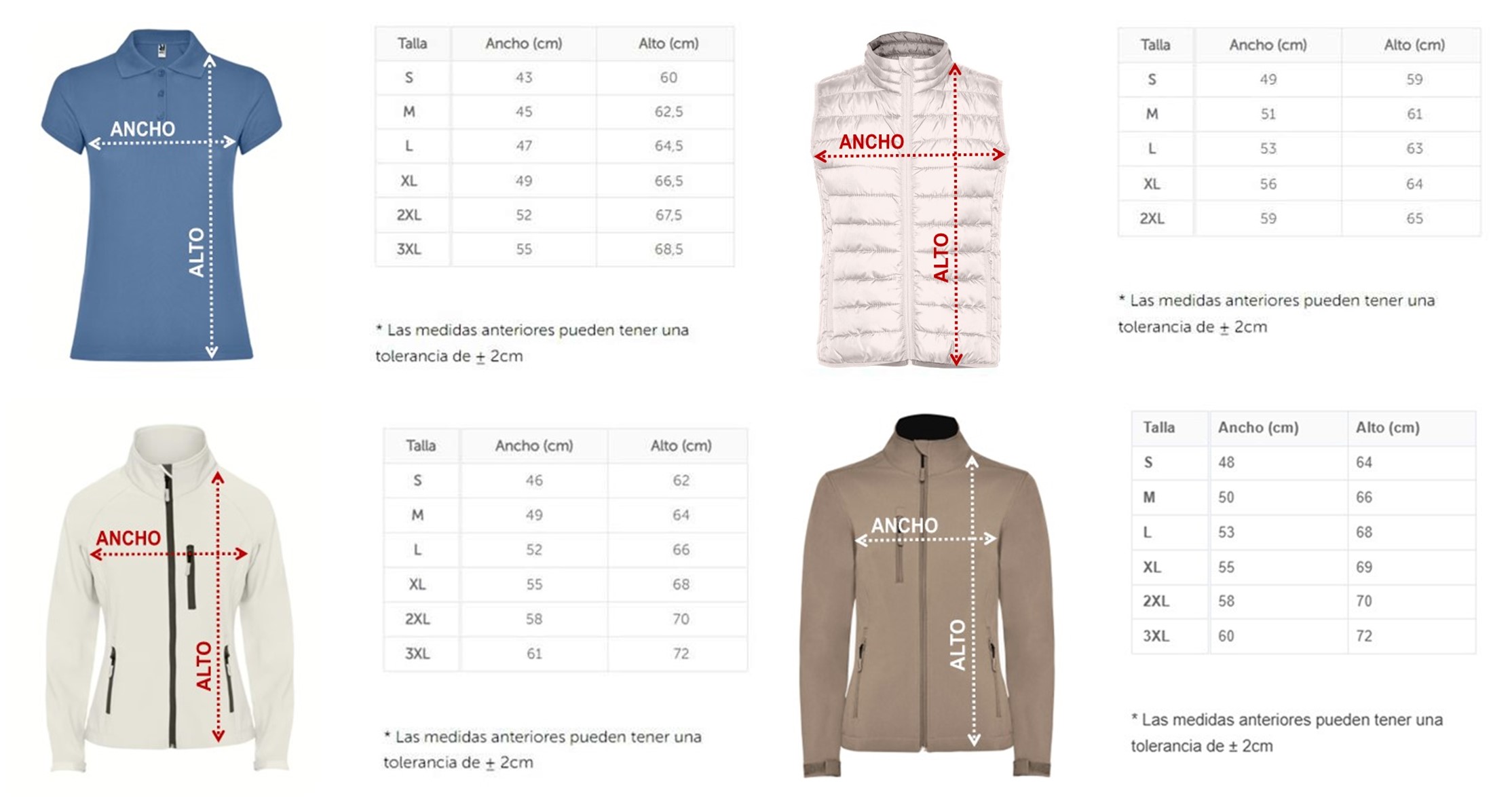 En el caso de la mujer, las medidas del polo son las mismas tanto en el blanco, como en el negro, azul y verde.